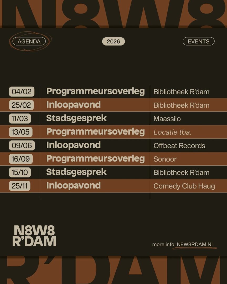 Om nog een klein tipje van de 2026-sluier te lichten: er staan spannende plannen op de agenda voor het Panel Deurbeleid, onze Supporters en de Nachtagenda. Via de site (www.n8w8rdam.nl), de socials en de nieuwsbrief (ps: schrijf je hier in!) ben je het hele jaar op de hoogte van onze fratsen. En bereikbaar zijn we sowieso! Bel, mail, sms, ping, postduif ons voor alles of voor helemaal niets.
